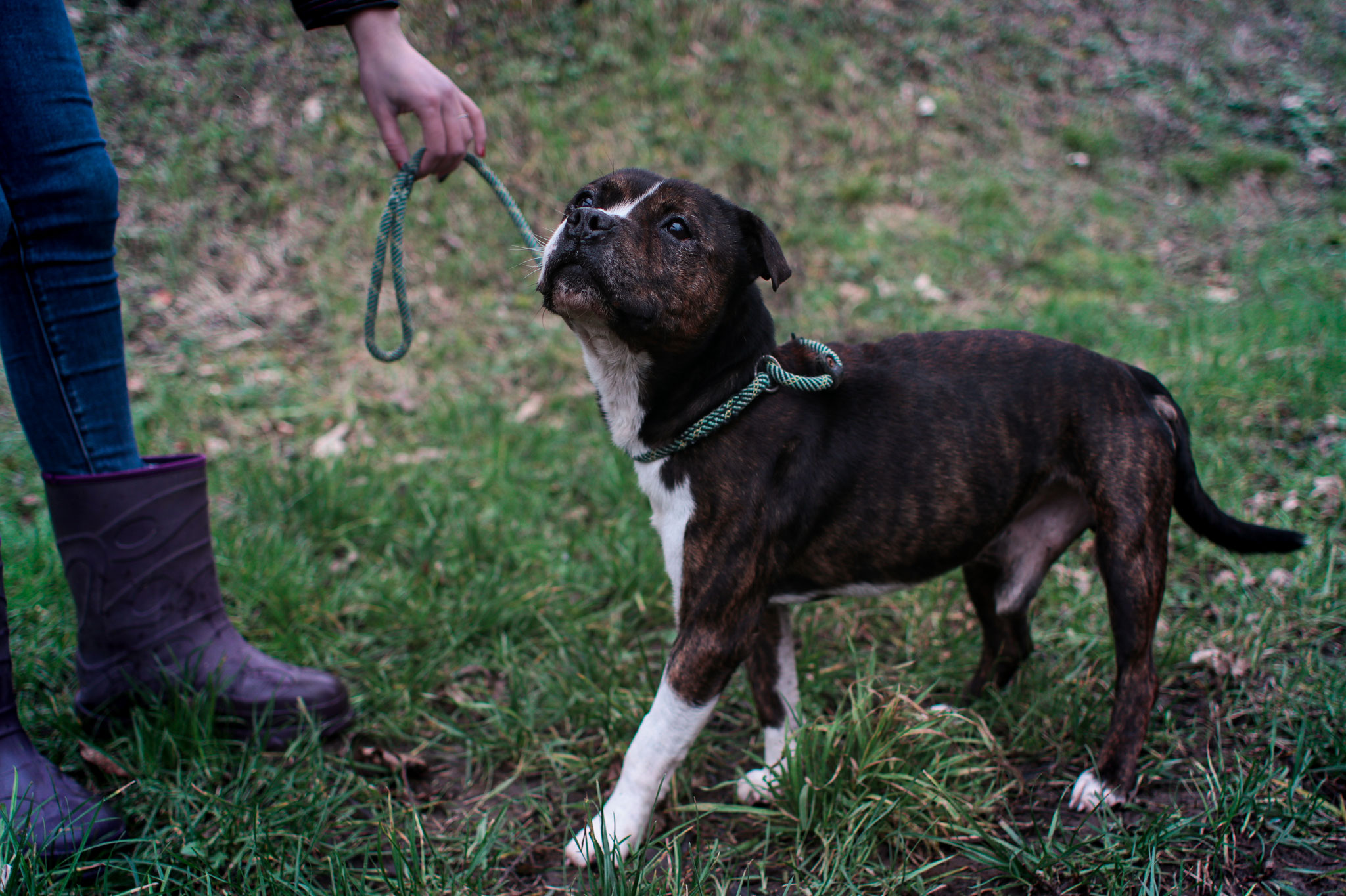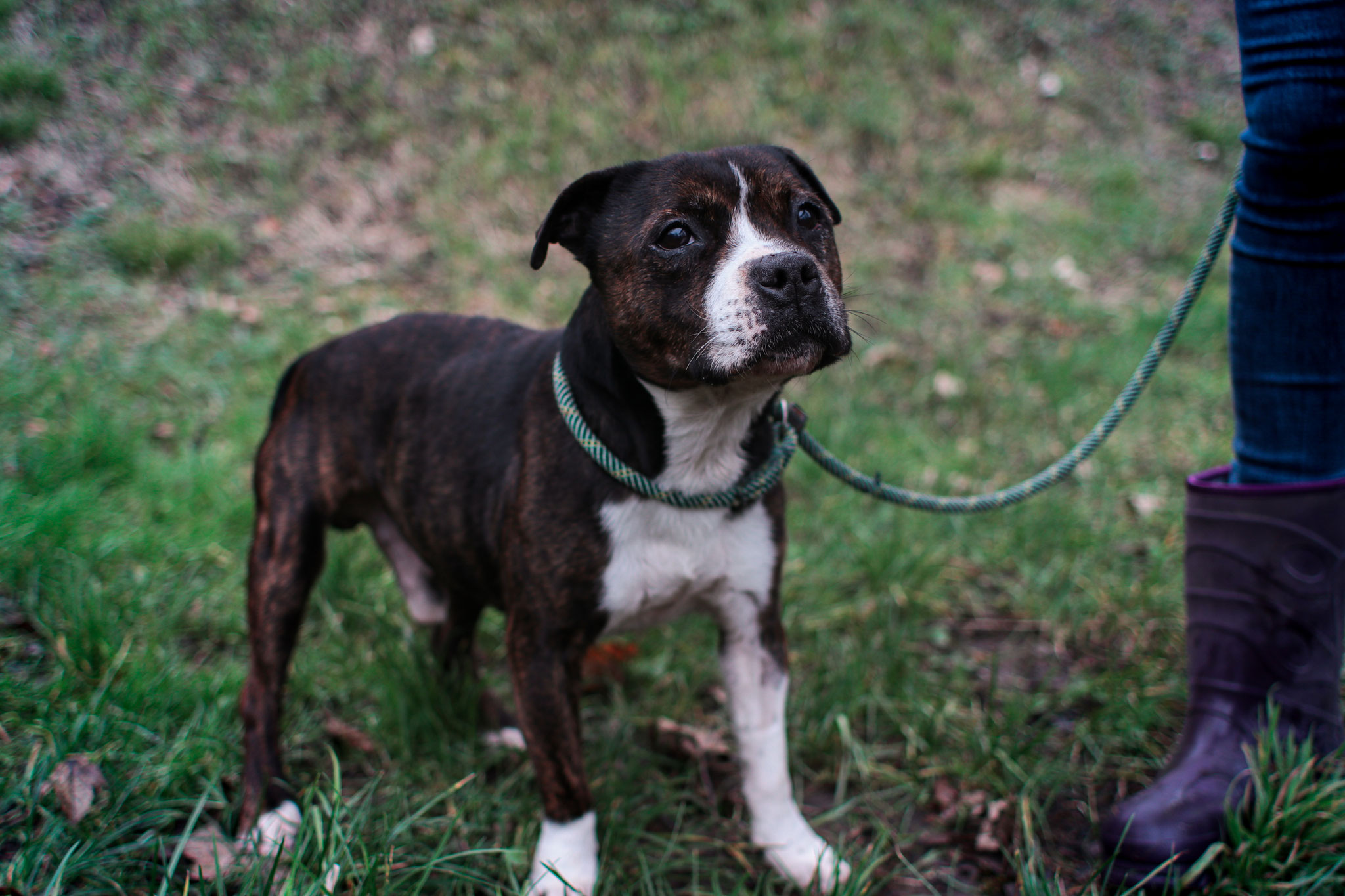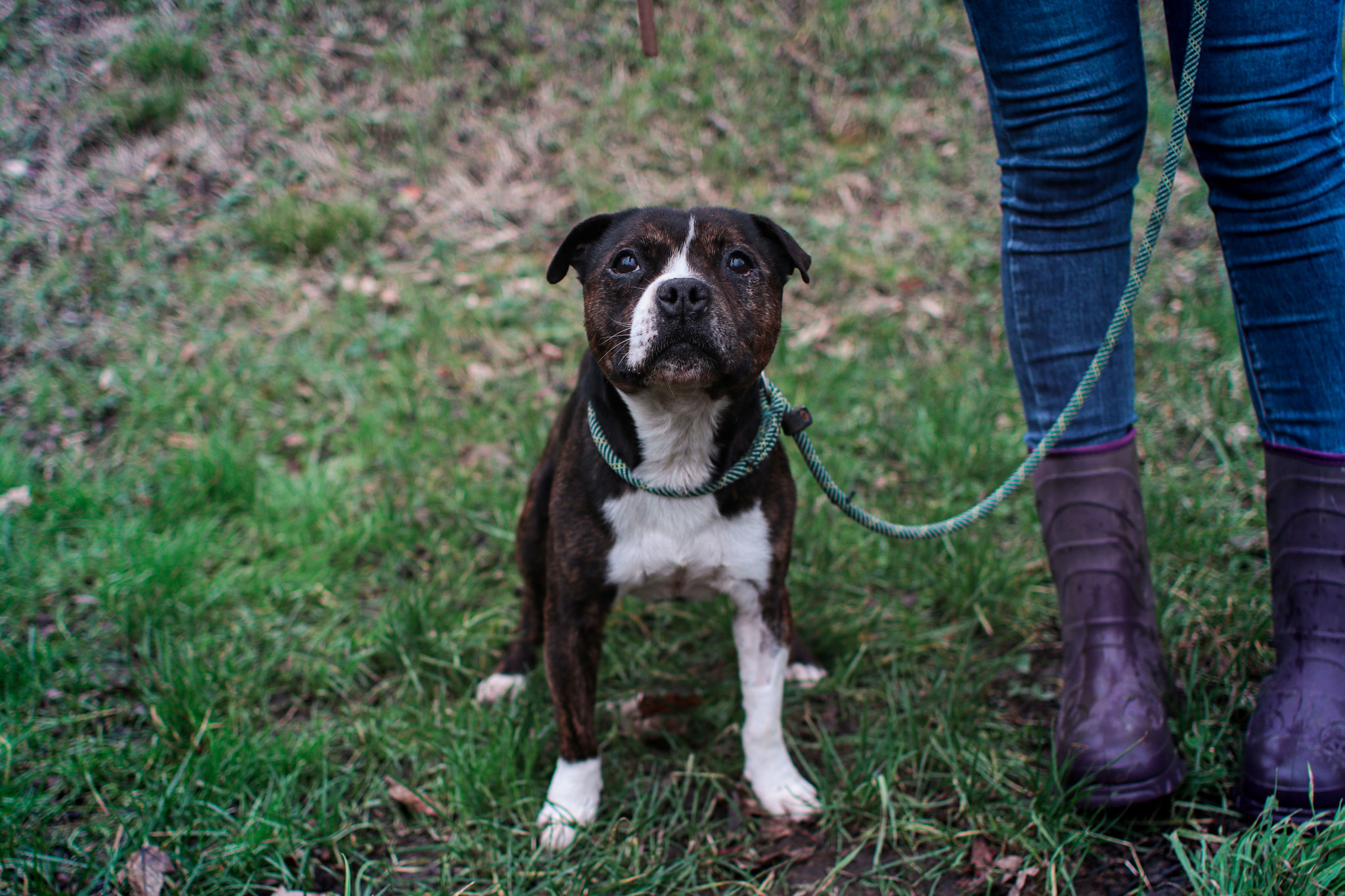 Jack est un Staffie de 11 ans, arrivé récemment au refuge dans un état de maigreur important. Il reprend aujourd’hui doucement du poids, mais son arrivée en refuge reste encore perturbante pour