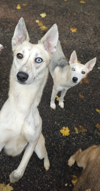 Habitués à vivre en groupe, ils ont besoin d’un compagnon canin et ne sont pas adaptés à un placement en chien unique. La cohabitation avec les chats peut être possible avec un travail d’acclimatation calme et progressif.